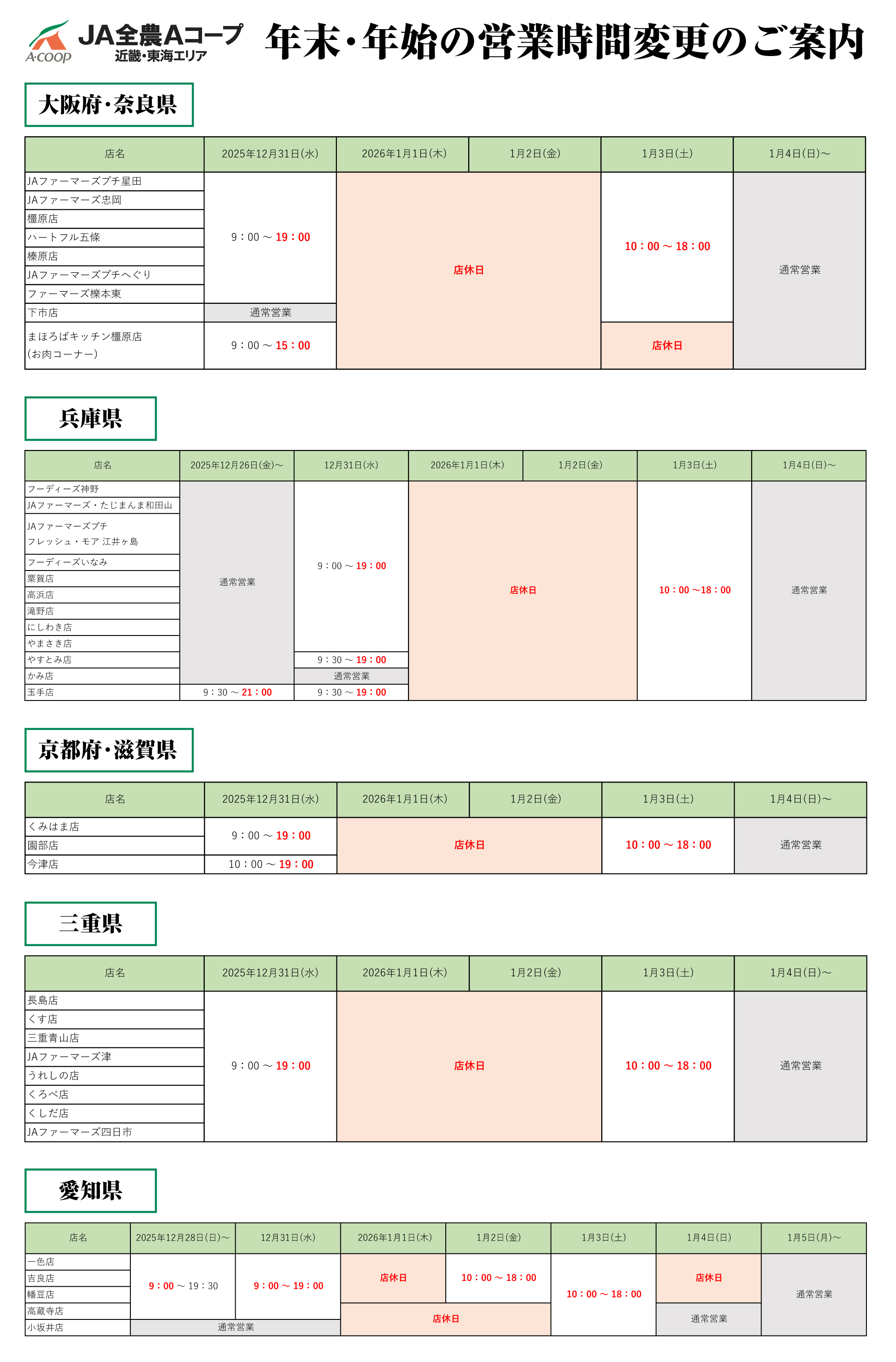 2025.12.22 一部店舗を除き、12月26日(月)~12月31日(水)の営業時間を変更させていただきます。 年始は店舗により異なりますので、詳しくは下記の一覧をご確認お願い申し上げます。 年末・年始の営業時間はこちら お知らせ一覧 牛肉トレーサビリティ JA全農 JA全農Aコープ